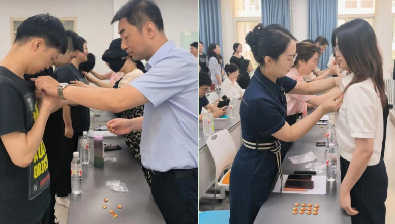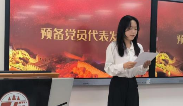 教师党员代表为30位新党员佩戴党员徽章,2022级孟成真代表新发展党员做表态发言,公司党委书记李建梅做总结讲话。