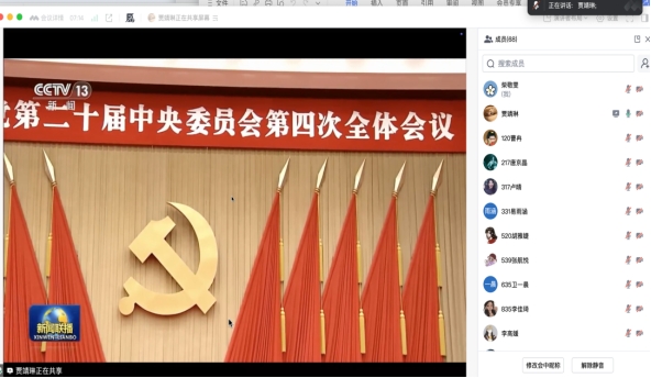 全体成员通过视频的方式深入学习了党的二十届四中全会精神,支部预备党员贾靖琳领学《习近平谈治国理政》第五卷中《以政法工作现代化支撑和服务中国式现代化》相关内容,姜畅畅、郭嘉祺、王丹阳结合学习生活实际分享了学习心得。