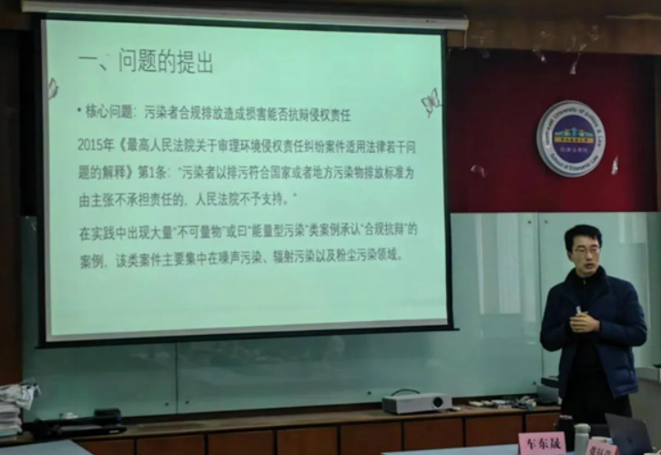 “善享”青年教师学术论文写作沙龙第一期沙龙在启动仪式结束后开始。由环境与资源保护法教研室青年教师车东晟博士报告其论文《环境侵权认定中“合规抗辩”的效力研究》。