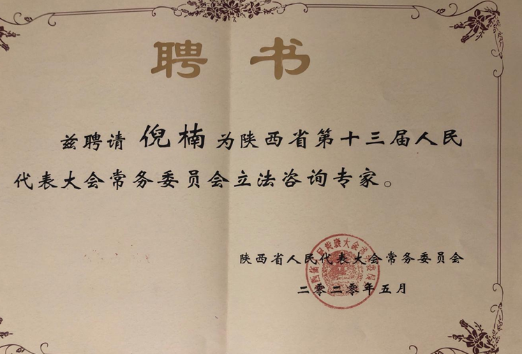 近日,公司倪楠副教授被陕西省第十三届人民代表大会常务委员会聘请为立法咨询专家。