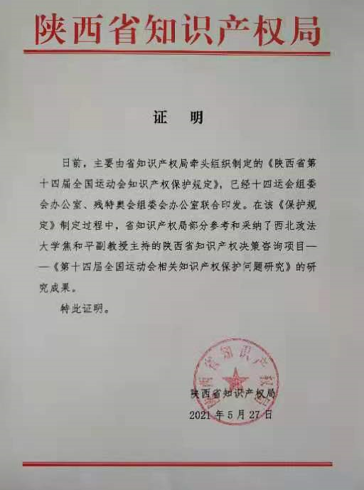 《保护规定》采纳了公司焦和平副教授2020年主持的陕西省知识产权决策咨询项目——《第十四届全国运动会相关知识产权保护问题研究》的研究成果,是我国目前首个国内大型体育赛事知识产权保护规范性文件。《保护规定》的出台,为十四运会知识产权保护提供了制度保障,能够有效加大十四运会知识产权保护力度,严厉打击知识产权侵权违法行为,维护十四运会知识产权权利人的合法权益,展示陕西良好的对外开放形象和营商环境,进而推动实现十四运会应有的社会效益和经济效益。