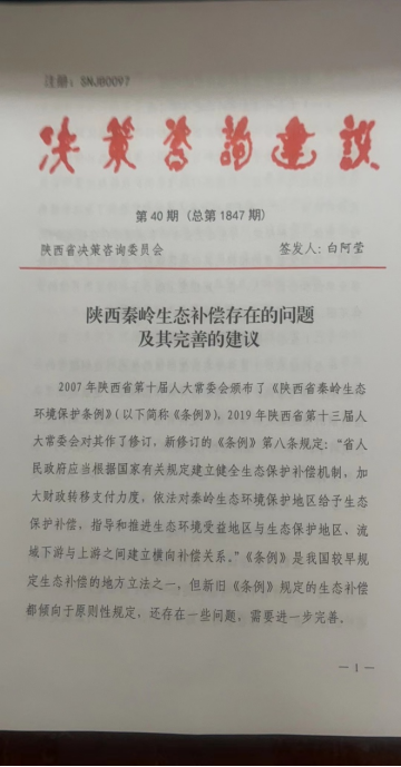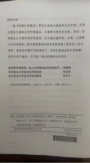 该决策咨询建议源于公司教师李亚菲主持的陕西省社科基金项目《陕西秦岭生态补偿法律问题研究》(2019F009)的阶段性成果。决策咨询建议归纳的秦岭生态补偿的主要问题有:一是生态补偿责任主体的认定不明确;二是生态补偿的标准不清楚,无法达成补偿标准和数额的统一;三是生态补偿的对象含糊不清;四是生态补偿未能体现秦岭特殊的生态环境功能,范围狭窄;五是补偿方式及资金来源单一,过分依赖国家的财政投入,未及时创新环境生态利益的价值实现方式和补偿资金的来源渠道;六是补偿实施缺乏具体的制度保障。以此为基础,该决策咨询建议提出了如下完善建议:一是继续深化秦岭生态补偿立法,扩大其适用范围;二是明晰生态补偿的补偿主体;三是准确界定生态补偿的被补偿主体;四是明确秦岭生态补偿的标准,加大补偿力度;五是丰富生态补偿的方式和机制;六是建立生态补偿基金,简化生态补偿程序,明确补偿款的分配。