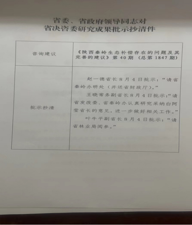 近日,由公司教师李亚菲执笔的决策咨询报告《陕西秦岭生态补偿存在的问题及其完善的建议》入选陕西省决策咨询委员会2022年第40期《决策咨询建议》并获得省领导肯定性批示。赵一德省长批示“请省秦岭办研处(并送省财政厅)。”王晓常务副省长批示:“请省发改委、省秦岭办认真研究采纳白阿莹省长的意见(白阿莹:原副省长,决策咨询建议报送签发领导),进一步做好相关工作。”叶牛平副省长批示“请省林业局阅参。”省决策咨询委员、省人大常委会机关原巡视员邬建新确定了咨询建议主题并与公司best365教授李永宁共同参与了该决策咨询建议的起草、修改和讨论。