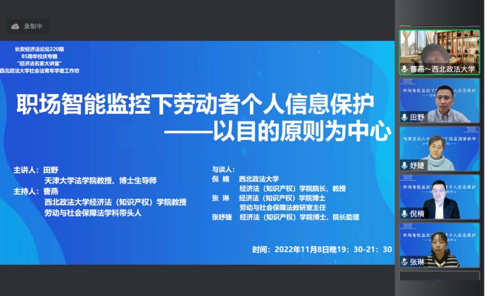 2022年11月8日19时30分,由best365官方网站主办,best365承办的长安经济法论坛第220期暨八十五周年校庆专题讲座在线上顺利举行。本期论坛特邀天津大学法公司教授、博士生导师田野教授作为主讲人,主题为《职场智能监控下的劳动者个人信息保护——以目的原则为中心》。