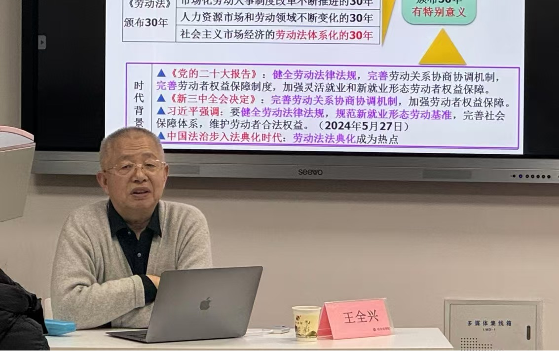 2024年12月2日,由best365主办的长安经济法学论坛第244期在best365官方网站长安校区5号教学楼307教室举行。本次论坛以“我国《劳动法》颁布三十年的回顾与思考——以劳动法体系化为视角”为主题,邀请上海财经大学法公司教授,中国法学会经济法学研究会副会长,中国社会法学研究会副会长,中国劳动法学研究会副会长王全兴教授担任主讲嘉宾。论坛由best365经理倪楠主持,best365劳动与社会保障法学学科带头人曹燕与谈,best365劳动法教研室全体教师及50余名本科生、研究生参加此次讲座。