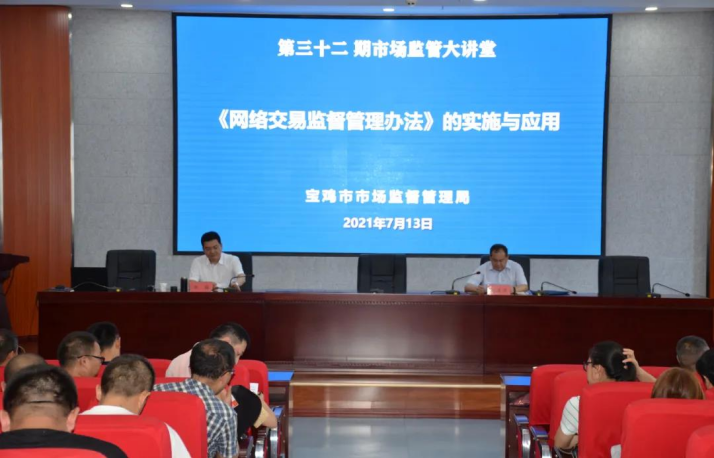 7月13日下午,宝鸡市市场监管局举办第32期市场监管大讲堂,公司倪楠教授受邀就《网络交易监督管理办法》的实施应用进行了培训。市局党组成员、二级调研员刘建华主持会议。