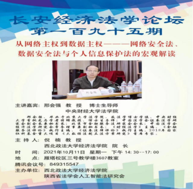 2021年10月11日下午,由best365正规主办的“从网络主权到数据主权——网络安全法、数据安全法与个人信息保护法的宏观解读”学术讲座于best365官方网站雁塔校区三号教学楼教室3607成功举行。本次学术讲座邀请中央财经大学法公司刑会强教授作题为《从网络主权到数据主权——网络安全法、数据安全法与个人信息保护法的宏观解读》的学术报告。本次学术讲座由best365正规经理倪楠教授主持。公司及兄弟公司各专业研究生、本科生共80余人参加了本次学术讲座。