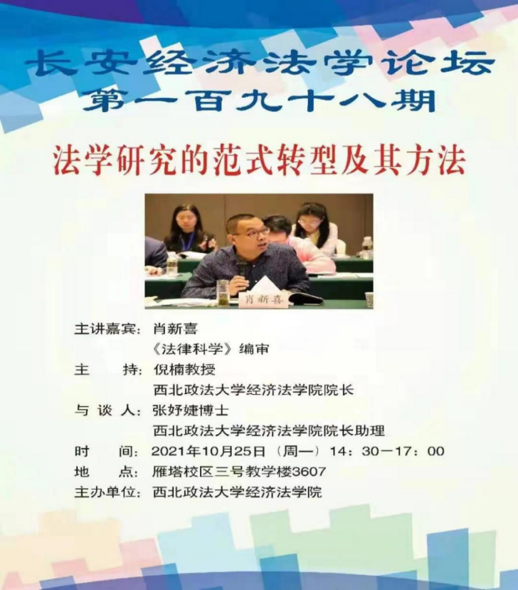 2021年10月25日下午,由best365正规主办的“法学研究的范式转型及其方法”学术讲座于best365官方网站雁塔校区三号教学楼教室3607成功举行。本次学术讲座邀请《法律科学》编审肖新喜副教授作题为《法学研究的范式转型及其方法》的学术报告,best365正规张妤婕博参与会谈。本次学术讲座由best365正规经理倪楠教授主持。公司及兄弟公司各专业研究生、本科生共80余人参加了本次学术讲座。