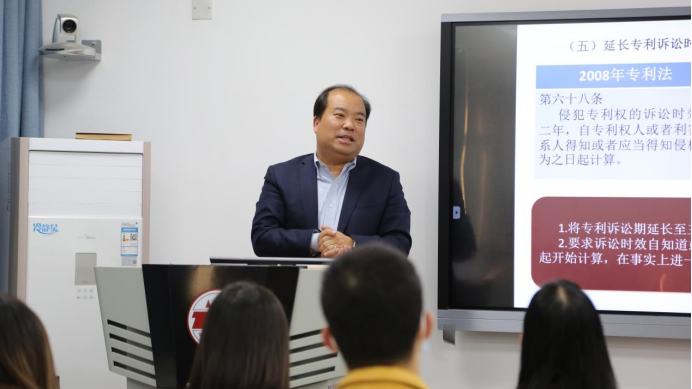 为深入学习贯彻习近平法治思想,公司于11月24日在长安校区诚意楼309教室举办了主题为“习近平法治思想背景下的《专利法》修改与实务应用解读”的讲座。本次讲座由我院副教授,宝伦律师事务所白银涛主任与谈,各年级共30余位同学参加。讲座由我院副经理薛亮老师主持。