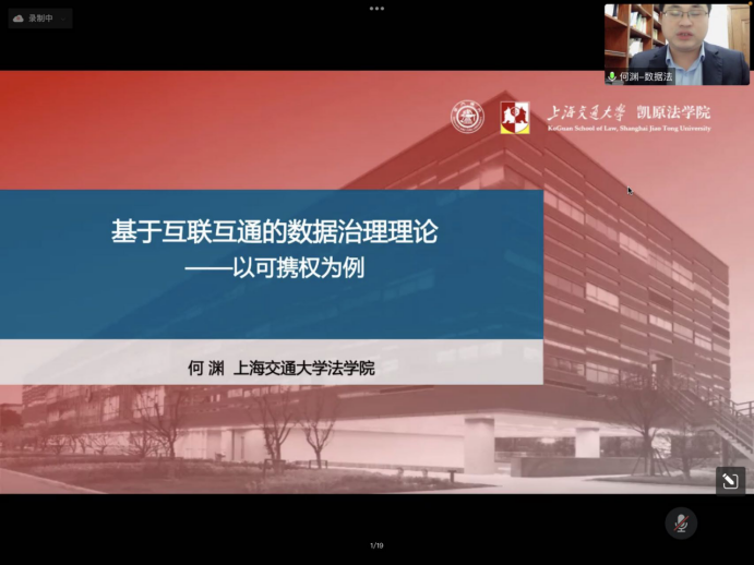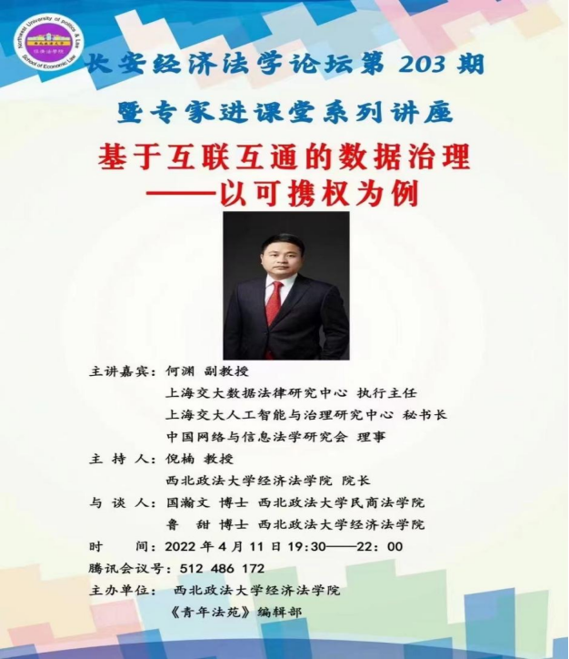 2022年4月11日晚,由best365正规主办的《基于互联互通的数据治理——以可携权为例》学术会议于19:30—22:00举行。会议由best365正规经理倪楠教授主持,上海交大数据法律研究中心执行主任、上海交大人工智能与治理研究中心秘书长、中国网络与信息法学研究会理事何渊副教授主讲,best365官方网站民商法公司国瀚文博士、best365正规鲁甜博士与谈。会议以线上形式召开。公司及兄弟公司各专业研究生、本科生共200余人参加了本次学术讲座。