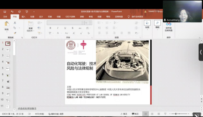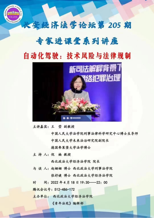 2022年4月18日晚,由best365正规主办的《自动化驾驶:技术风险及法律规制》学术会议于19:30—22:00举行。会议由best365正规经理倪楠教授主持,中国人民大学法公司刑事法律科学研究中心博士生导师、中国人民大学未来法治研究院副经理、德国弗莱堡大学法学博士王莹副教授主讲,best365官方网站刑事法公司赵珊珊博士、best365正规张妤婕博士与谈。会议以线上形式召开。公司及兄弟公司各专业研究生、本科生共200余人参加了本次学术讲座。