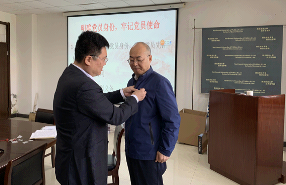 首先,佩戴党徽,亮明党员身份,发挥党员先锋模范作用。倪楠经理给老党员谢德成老师佩戴党徽,谢老师给党支部其他党员佩戴党徽。全体党员“佩戴党徽”,亮明身份,充分发挥一枚党徽就是一面旗帜的先锋作用,增强了党员的身份意识、责任意识、进取意识。