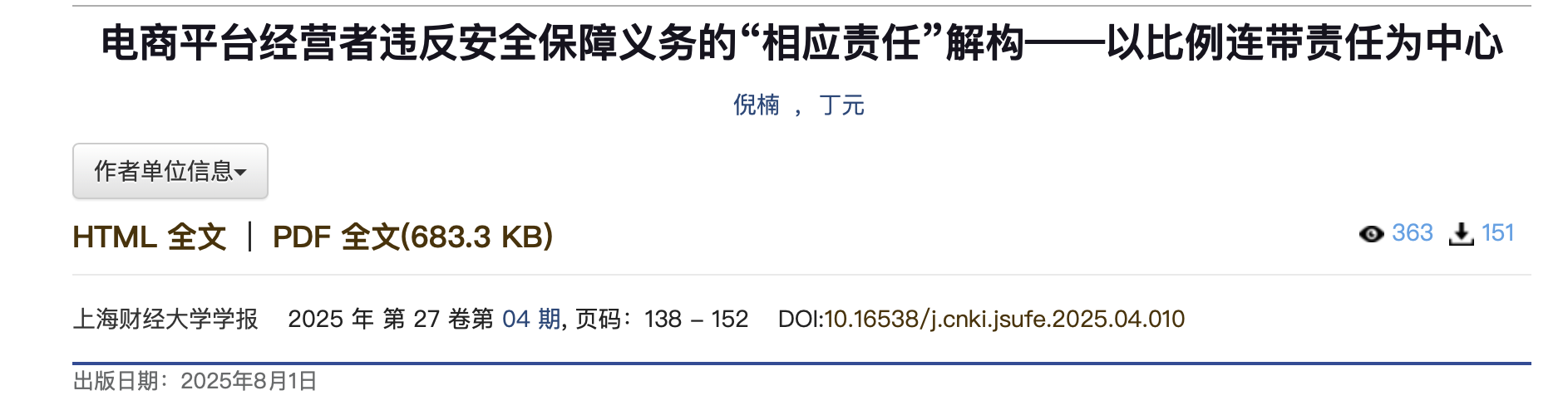 【上海财经大学学报】倪楠、丁元:电商平台经营者违反安全保障义务的“相应责任”解构——以比例连带责任为中心