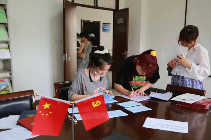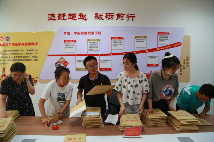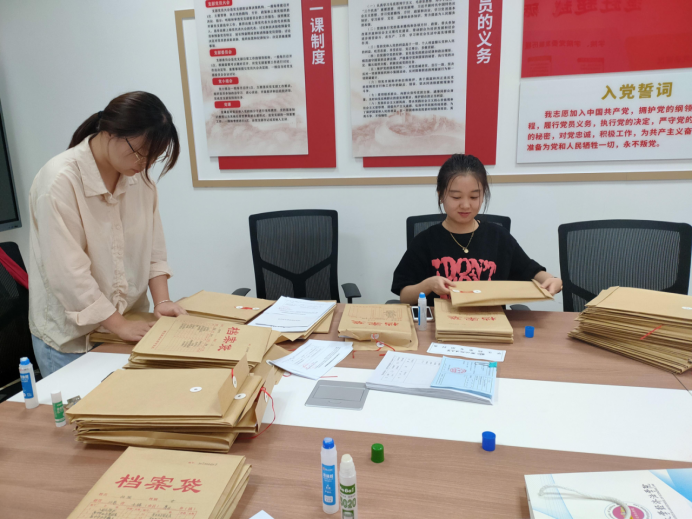 在长安校区资料室和综合活动室,一份份档案材料被分类并反复检查核对,再装入档案袋,写清档案目录,封好封条,按学号排好序,盖上骑缝章,这样的动作要重复成百上千次,琐碎而单调,但每个党员都丝毫不敢懈怠,严谨细致的他们一个个分工明确,工作在有条不紊的进行着。经过6月30日下午和7月4日下午的紧张工作,300份档案分类分批次装完归档,总计装入1800份材料。这一摞摞档案整整齐齐平躺在那里,就是一份沉甸甸的责任,也是一种甘于付出、勇于担当的真实写照。