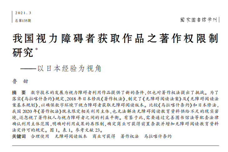 我国视力障碍者获取作品之著作权限制研究_以日本经验为视角_鲁甜.pdf